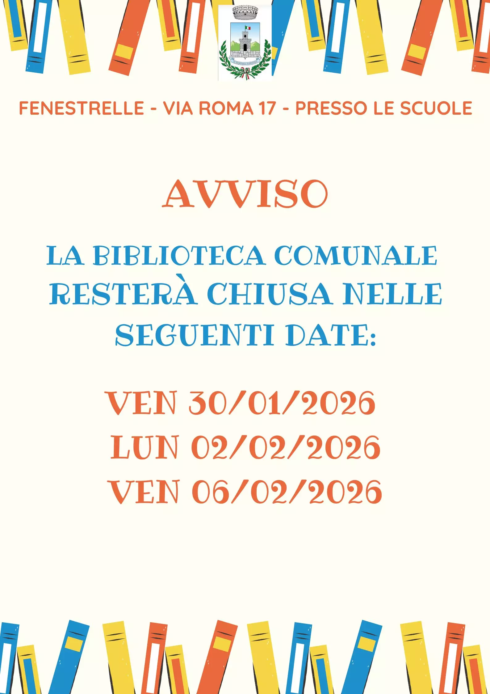 Descrizione LA BIBLIOTECA COMUNALE resterà chiusa NELLE SEGUENTI DATE: VEN 30/01/2026 LUN 02/02/2026 VEN 06/02/2026